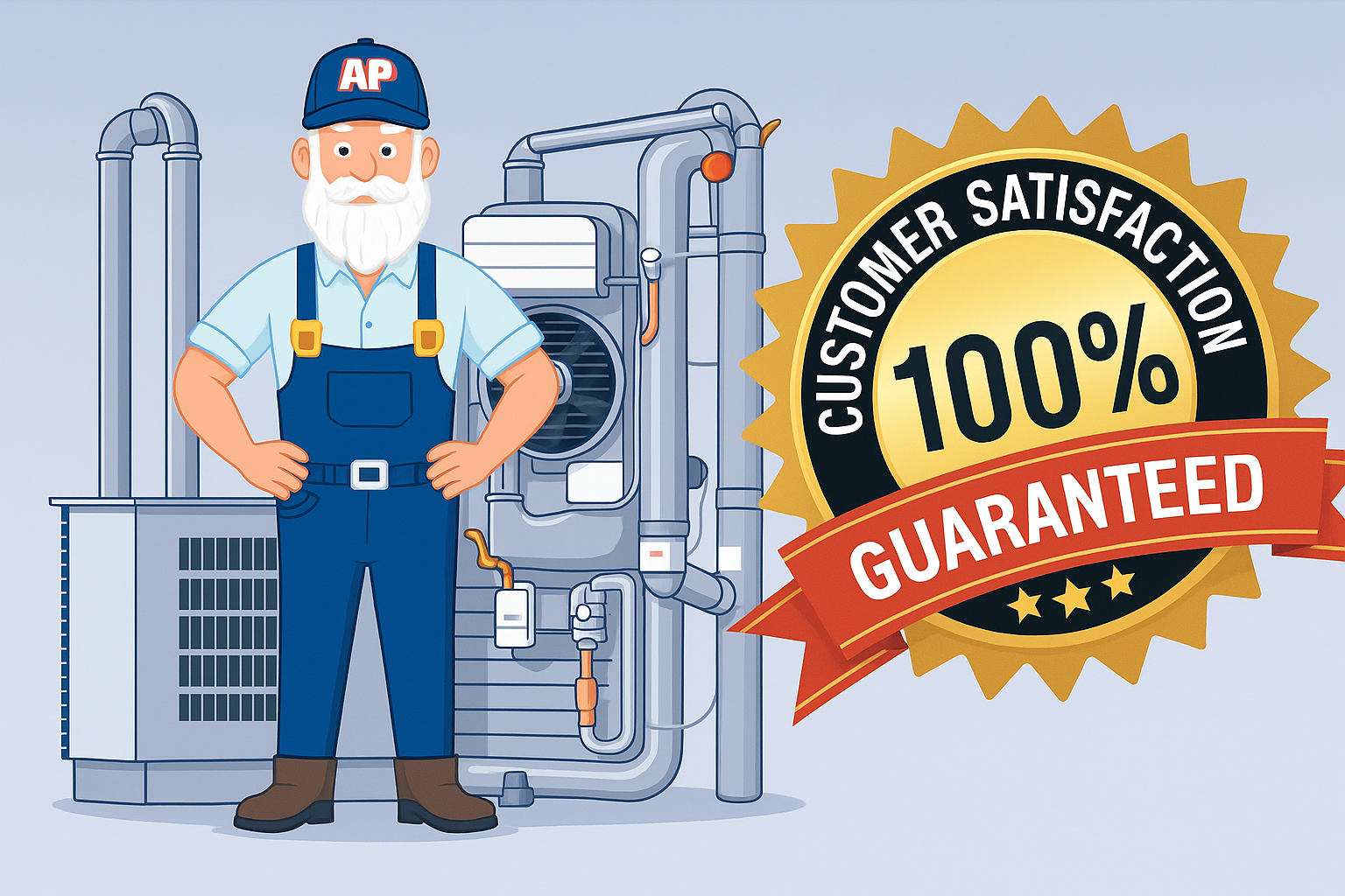 100% Satisfactaion Guarantee on Heating and Cooling Services and New Equipment, and Regfrigeration Services from AP Mechanical